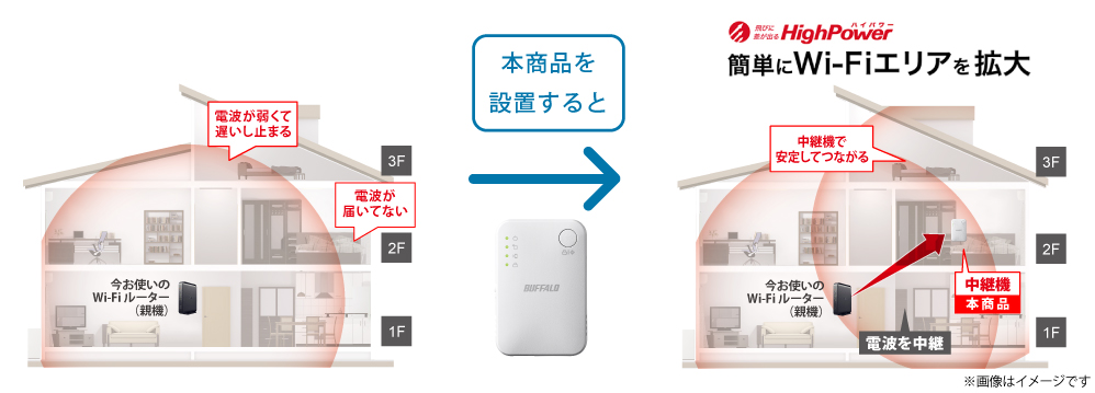 - Wi-Fiの届かない部屋を手軽にカバーできる中継機